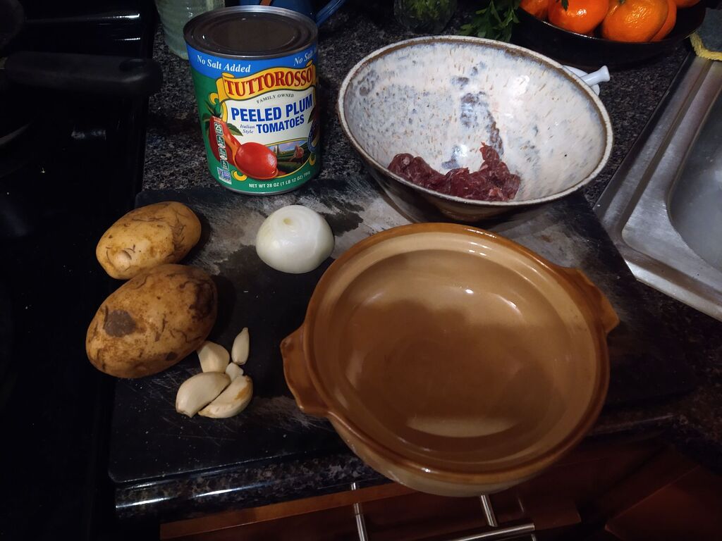Peel and slice potatoes 2cms thick. Cut veal into small cubes. Peel and chop tomatoes coarsely. Peel garlic and halve diagonally. Slice onions very thin, keeping all items separate.