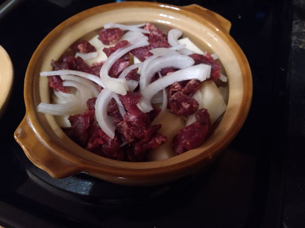 I had 2 russet potatoes that were not in great shape. (I had purchased them on delivery instead of looking them over in the store, and this batch was damaged. The delivery place gave me a full refund for the potatoes after I sent them a picture. Then I split up the bag with a few people so we could use them up before they went off. So I washed them and peeled them and sliced them into thick rounds and put them in the casserole dish. And this is where I had my first misgivings – when I’m building a dish like this, I usually like to put the onions between the bottom of the dish and the main meat (or in this case potatoes) so that there’s less worry about sticking and burning. But we’re trying to follow the recipe here!