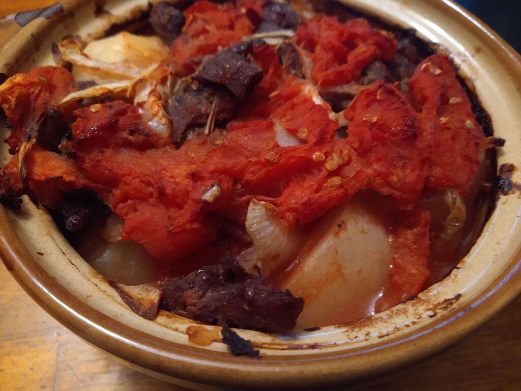 Once I had a solid layer of potatoes in there, I started tucking the garlic pieces and the small beef cubes around the potatoes. And then I (foolishly!) decided to not get another pan dirty by precooking the onions in the tomato juice, like in the second recipe, and just add them directly the way the first recipe says/implies. I added the tomato juice from the pan and sliced some of the tomatoes on top. Then it went in the oven!